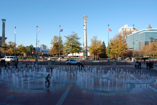 Наша маленькая стайка воссоединилась и мы пошли разглядывать не рассмотренную мною часть Атланты, в частности - Centennial Olympic Park. Находится он прямо напротив музея Колы и аквариума, отличается красивым фонтаном.