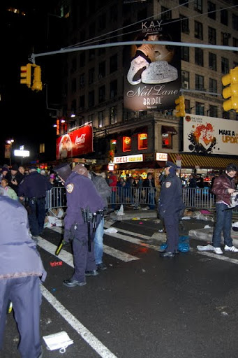 Полициии было... очень много, я столько наверное никогда в жизни не видела, и мне их было по человечески жалко, а они молодцы - оставались вежливыми и терпеливыми. Все улицы ведущие к 7 и Бродвей были перекрыты, попасть можно было только в определенных местах, после полицейского досмотра.